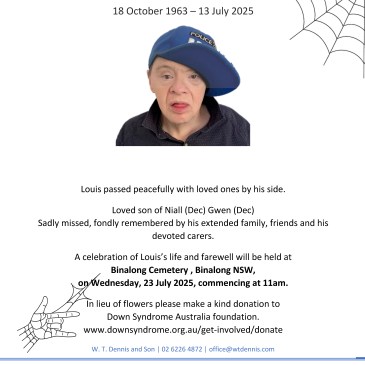 Louis Niall Browne 18 October 1963 – 11 July 2025 Louis passed peacefully with loved ones by his side.Loved son of Niall (Dec), Gwen (Dec)Sadly missed, fondly remembered by his extended family, friends and his devoted carers. A celebration of Louis’s life and farewell will be held atBinalong Cemetery, Binalong NSW, on Wednesday, 23 July … More In loving memory of Louis Browne