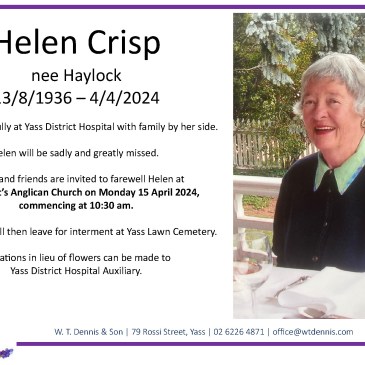 Helen Crisp (nee Haylock), born on 13/8/1936, peacefully passed away on 4/4/2024. Family and friends are invited to farewell her at St Clement’s Anglican Church on Monday 15 April 2024, at 10:30 am, followed by interment at Yass Lawn Cemetery. Donations can be made to Yass District Hospital Auxiliary. … More In memory of Helen Crisp
