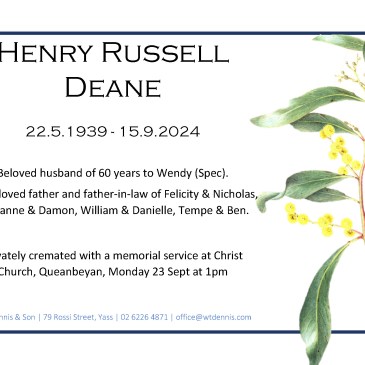 Henry Russell Deane, beloved husband and father, passed away on September 15, 2024. A memorial service will be held at Christ Church, Queanbeyan, on Monday, 23 September, commencing at 1pm. … More In loving memory of Henry Deane