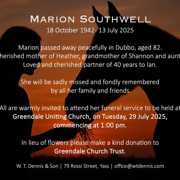 Marion Southwell 18 October 1942 – 13 July 2025 Marion passed away peacefully in Dubbo, aged 82. Cherished mother of Heather, grandmother of Shannon and Aunty.Loved and cherished partner of 40 years to Ian.She will be sadly missed and fondly remembered by all her family and friends. All are warmly invited to attend her funeral service … More In loving memory of Marion Southwell